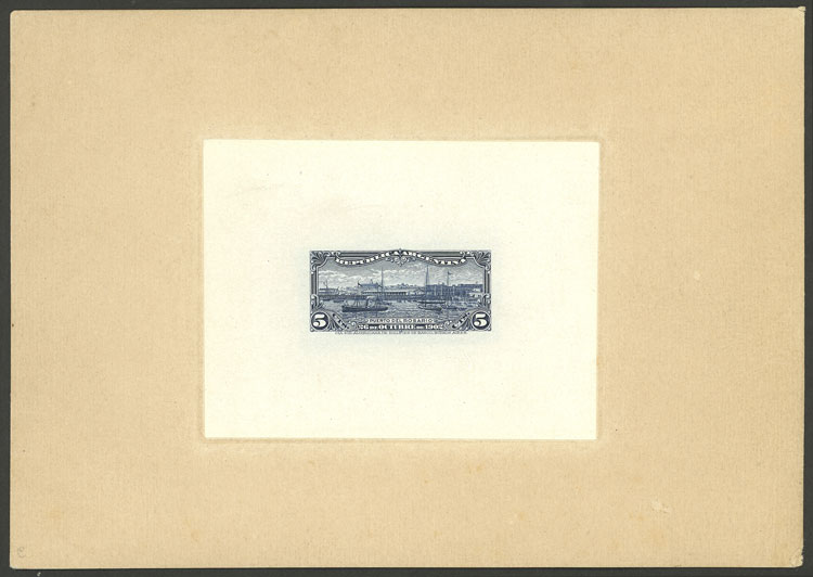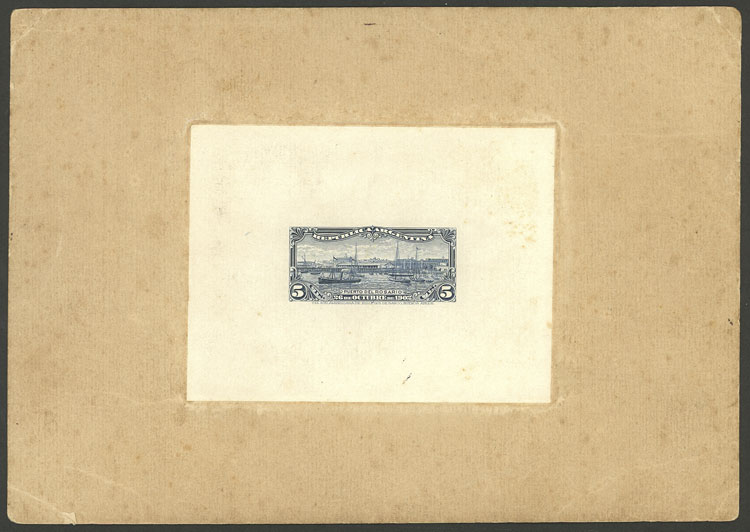 1902 Port of Rosario (ships, sailing boats, dock), DIE PROOF in dark blue, printed on glazed paper glued to card, VF (Image)