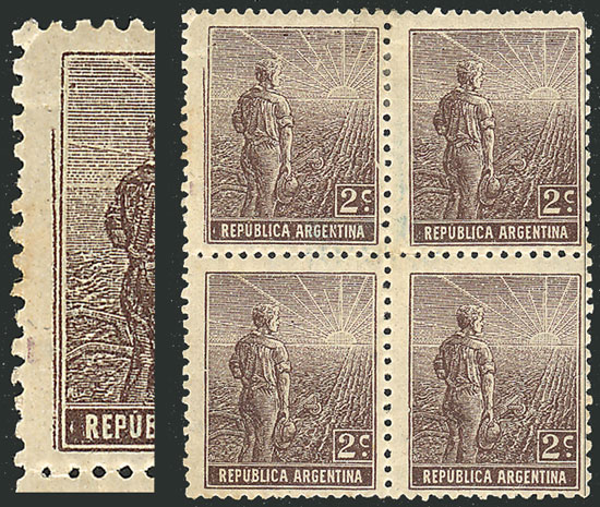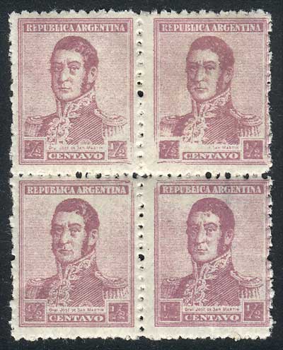 ½c. San Martín unwatermarked printed on Dutch paper, block of 4 with "very worn plate and retouches" variety, excellent quality! (Image)