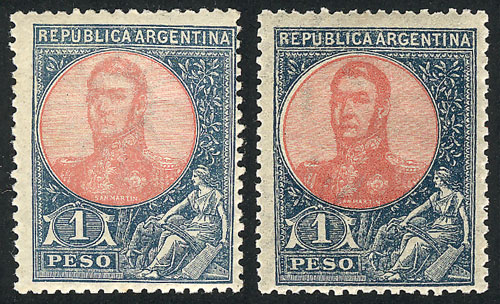 1908 1P. San Martín in oval, 2 examples in light blue and dark blue, excellent quality (one very lightly hinged), very fresh! (Image)