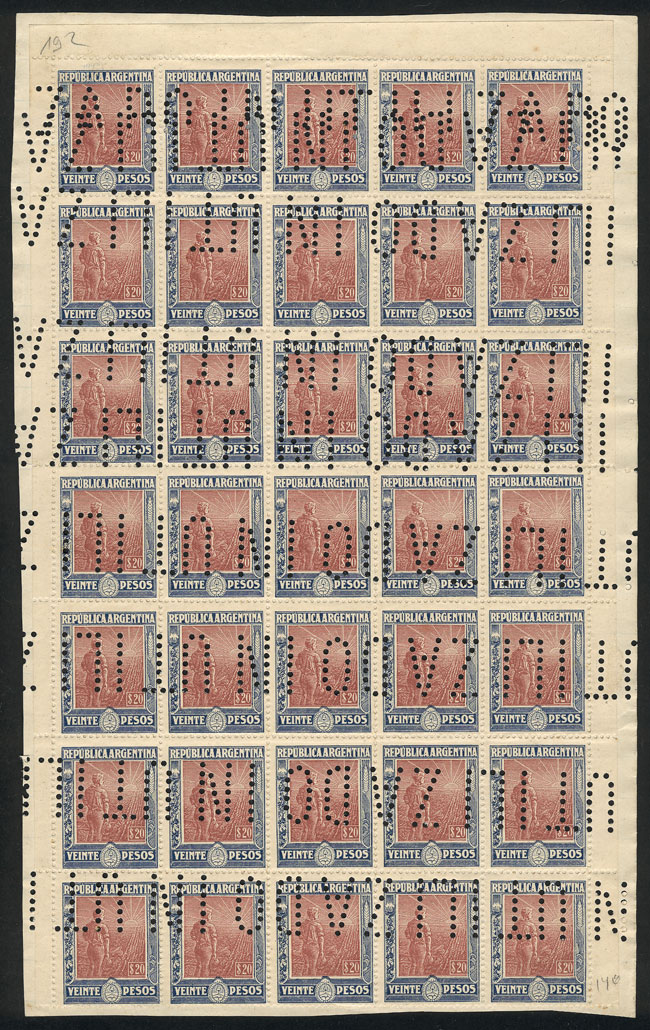 1912 20P. Plowman, block of 35 examples on a document sheet with invalidating "INUTILIZADO" perforations, excellent quality! (Image)