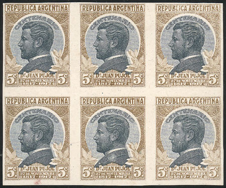 1918 Centenary of Dr. Juan Pujol, TRIAL COLOR PROOF printed on card glazed on both sides, block of 6 in the issued colors, VF quality, rare! (Image)