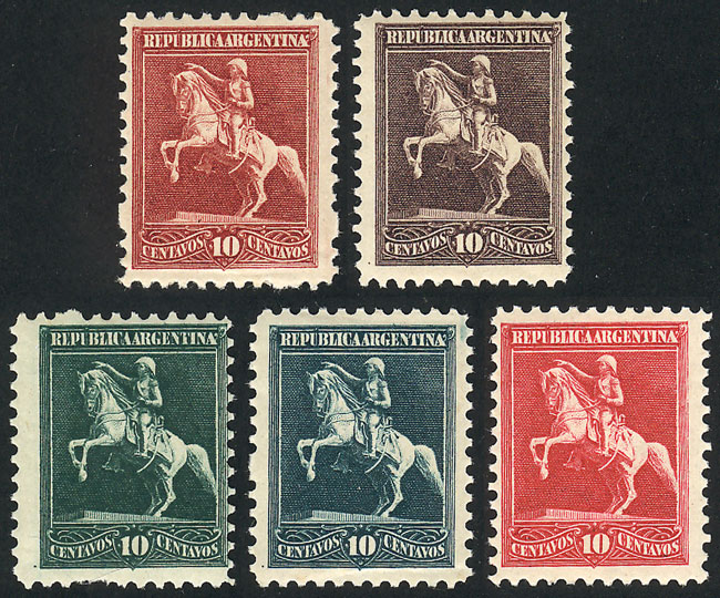 1910, 5 essays on an unadopted design, 10c. San Martin on horse, perforated and gummed, MNH, superb! (Image)