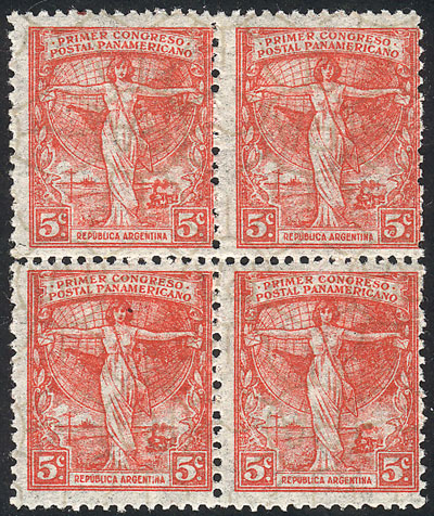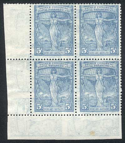 1921 5c. First Panamerican Postal Congress, corner block of 4 with DOUBLE IMPRESSION, ONE SIDEWAYS. Very rare block of 4, VF quality! (Image)