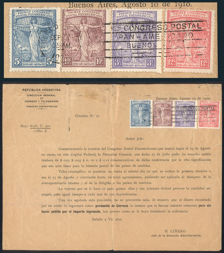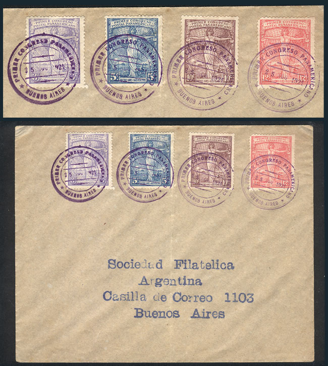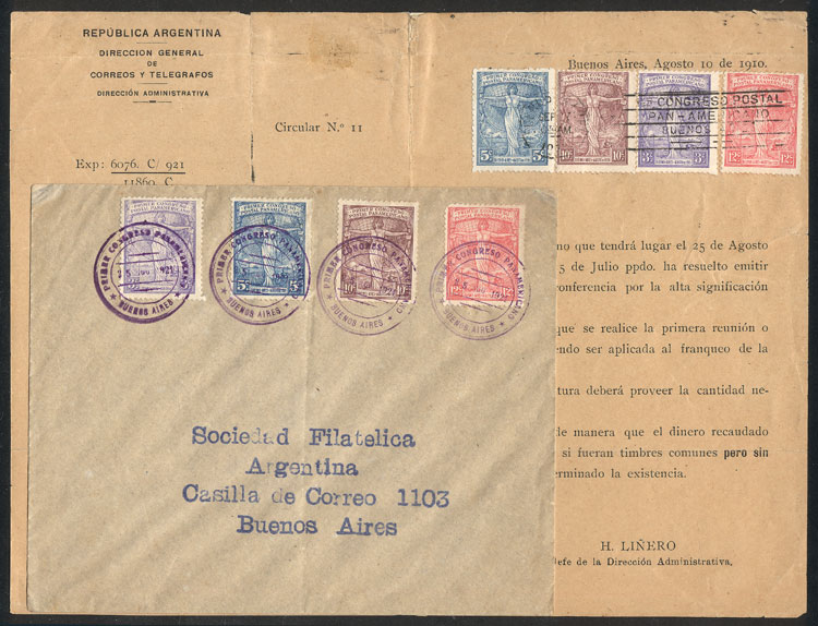 GJ.258/262, 1921 1st Pan-American Postal Congress, cmpl. set of 4 values on cover with violet postmark of the Congress for first day of issue (25/AU/1921). Also circular #11 of the Post with instructions about the sale of this issue and