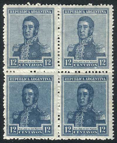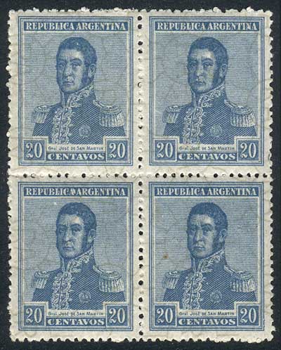 1923 20c. San Martín with watermark printed on front, block of 4 with THICK PAPER variety, mint never hinged, superb! Catalog value US$140 + 50% (MNH) (Image)