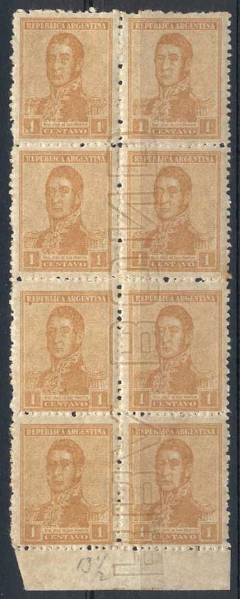 1918 1c. San Martín with watermark SERRA BOND, block of 8 with almost complete watermark (only missing 2 letters), VF quality, several examples are unmounted. Catalog value US$100+ (Image)