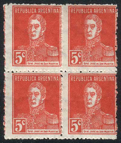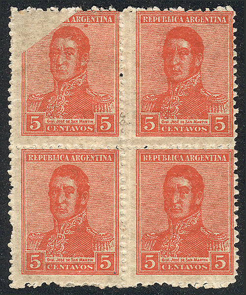 1918 5c. San Martín unwatermarked, block of 4, one PARTIALLY UNPRINTED in one corner, VF quality! (Image)