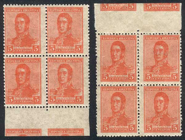 1918 5c. San Martín unwatermarked, 2 blocks of 4 with sheet margin at top and bottom, with partial impressions in the borders, VF! (Image)