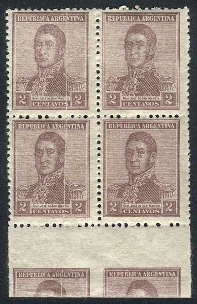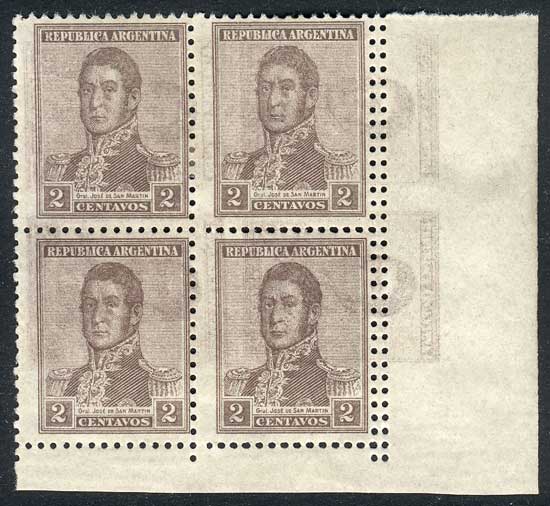 1918 2c. San Martín watermarked, corner block of 4 with varieties: double vertical perforation and DOUBLE IMPRESSION, one horizontal, fantastic and extremely rare!