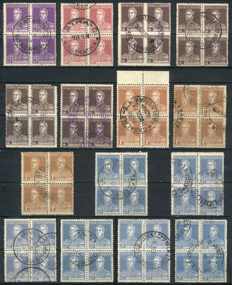 GJ.596 + other values, 148 used blocks of 4 with varied postmarks, including some very interesting and scarce, for example: Tacorazo, Mouras, Unanue, Casalins, Triliuke, Agencia 8, Ingeniero Jacobacci, San Antonio Oeste, Puerto San
