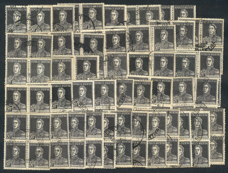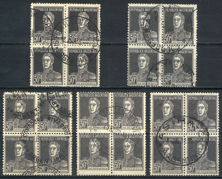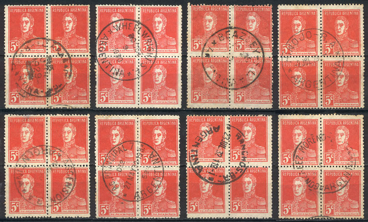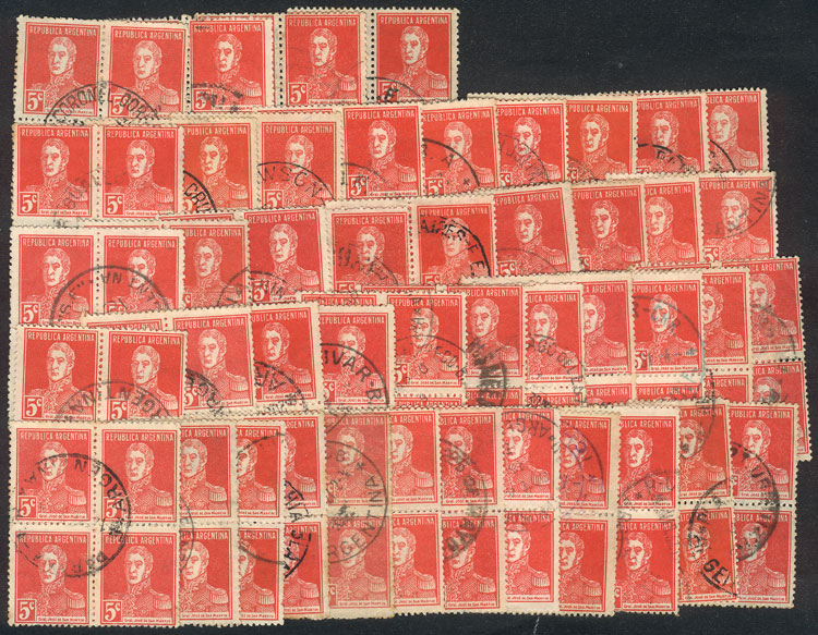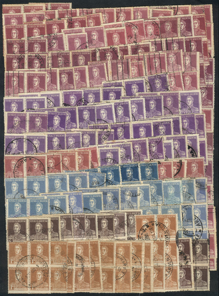 GJ.597, 48 used blocks of 4 with varied postmarks, including many very interesting and scarce, for example: Astra, Puerto San Julián, Comodoro Rivadavia, Dolores, Puerto Santa Cruz, etc etc, VF quality, very nice lot! ATTENTION: important
