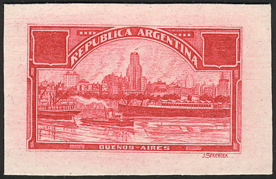 of an unadopted design, Port of Buenos Aires and Kavannah building (without value), carmine-rose, printed on card, very rare! (Image)