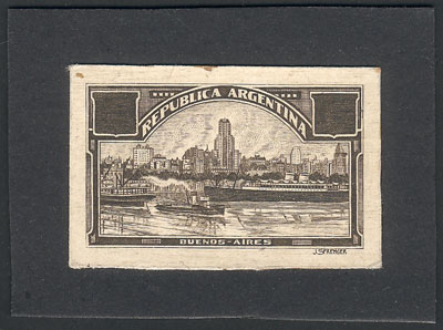 of an unadopted design, Port of Buenos Aires and Kavannah building (without value), very dark brown, printed on card, very rare! (Image)