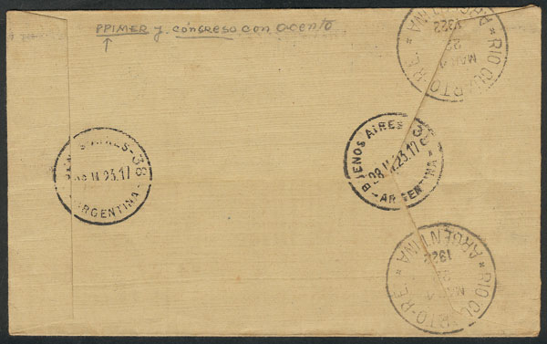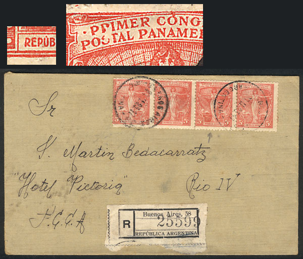 VARIETY ON COVER: GJ.535 in strip of 4, one with VARIETIES "PPIMER" and "Accents over the first O of CONGRESO", on a registered cover used in Buenos Aires on 28/NO/1923, rare! (Image) (Image-02)