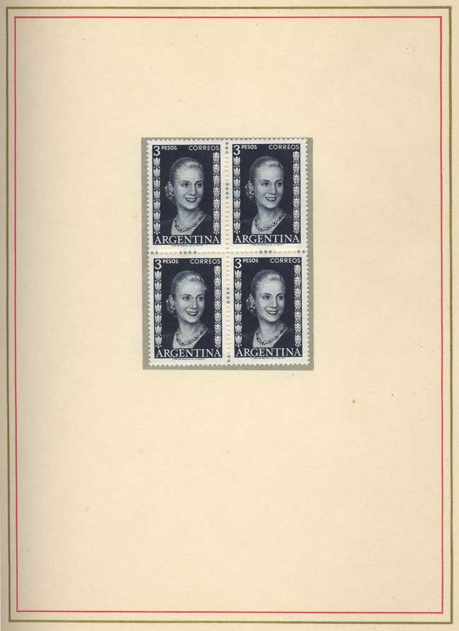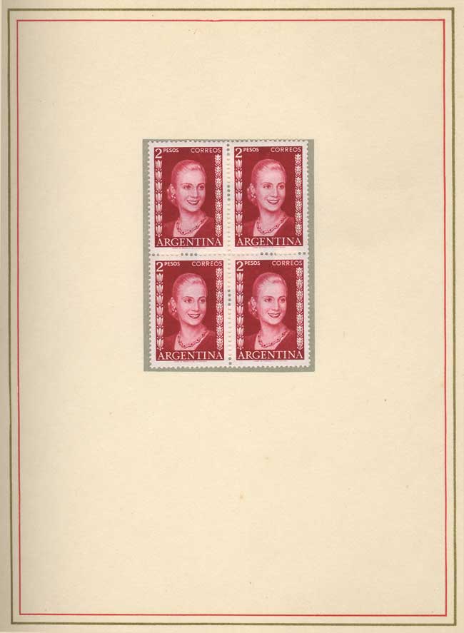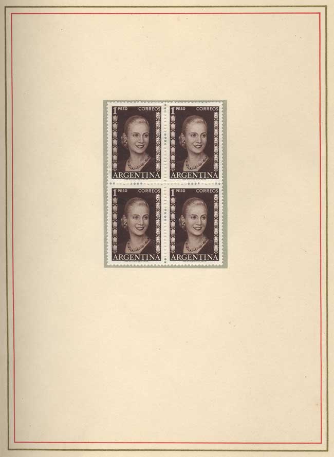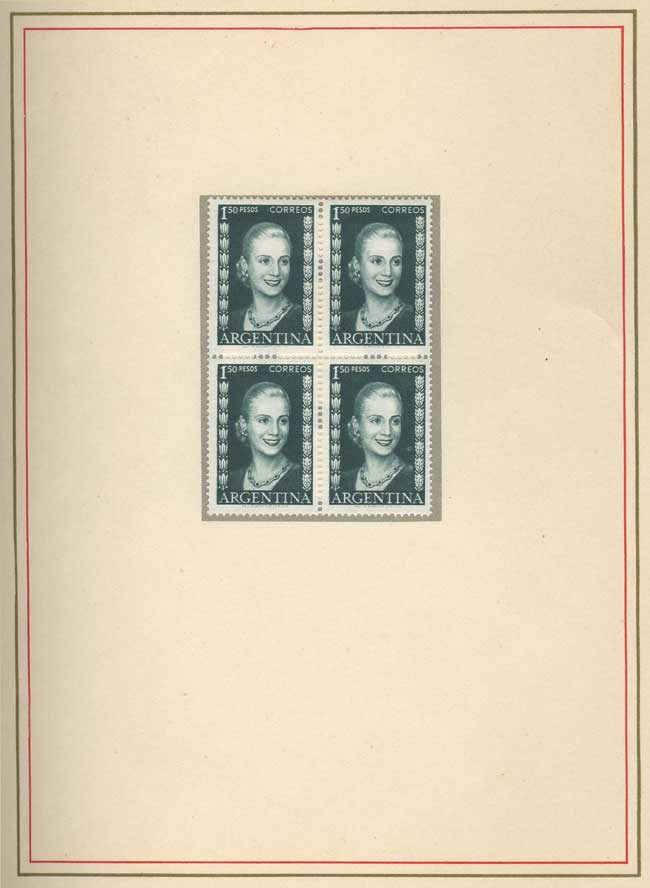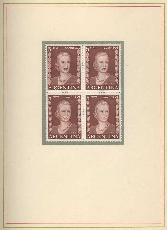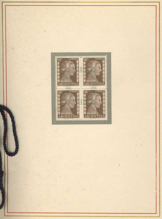 GJ.1003/22, 1952 Eva Perón, TRIBUTE BOOK prepared by the Post after her passing, edited in August 1952, it contains the set in BLOCKS OF 4, deluxe leather binding with golden impression of the coat of arms. Excellent quality, rare! (Image) (Image-02)