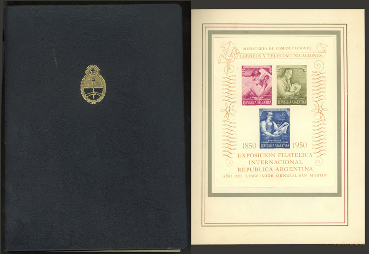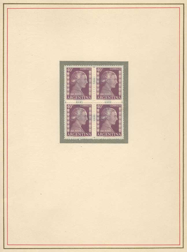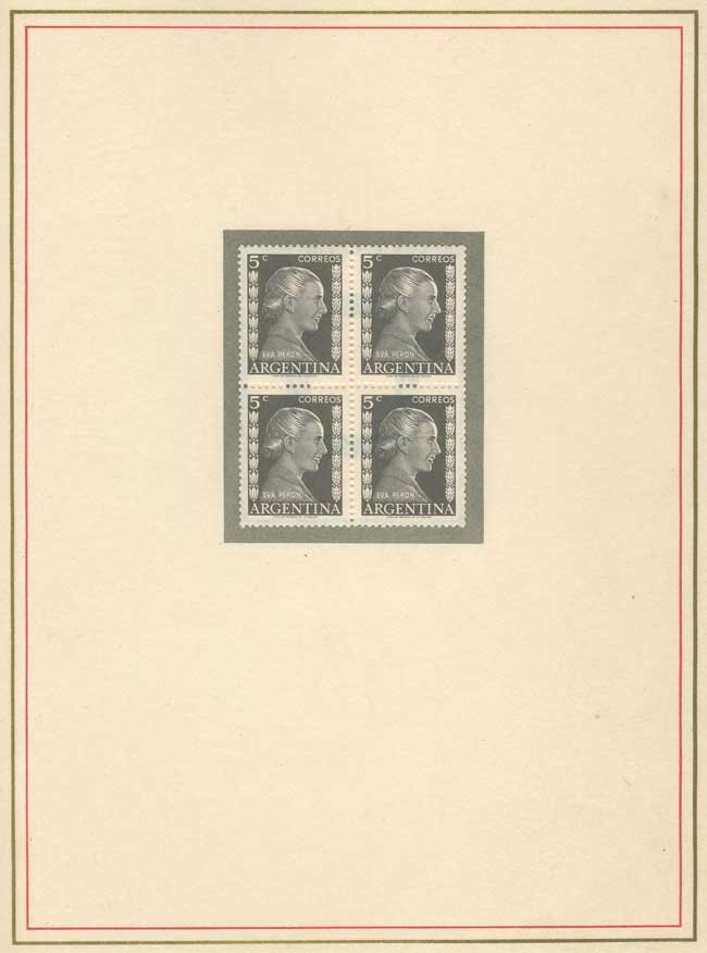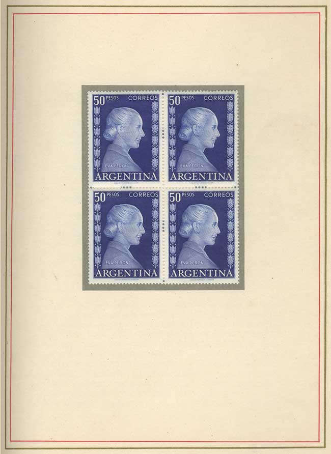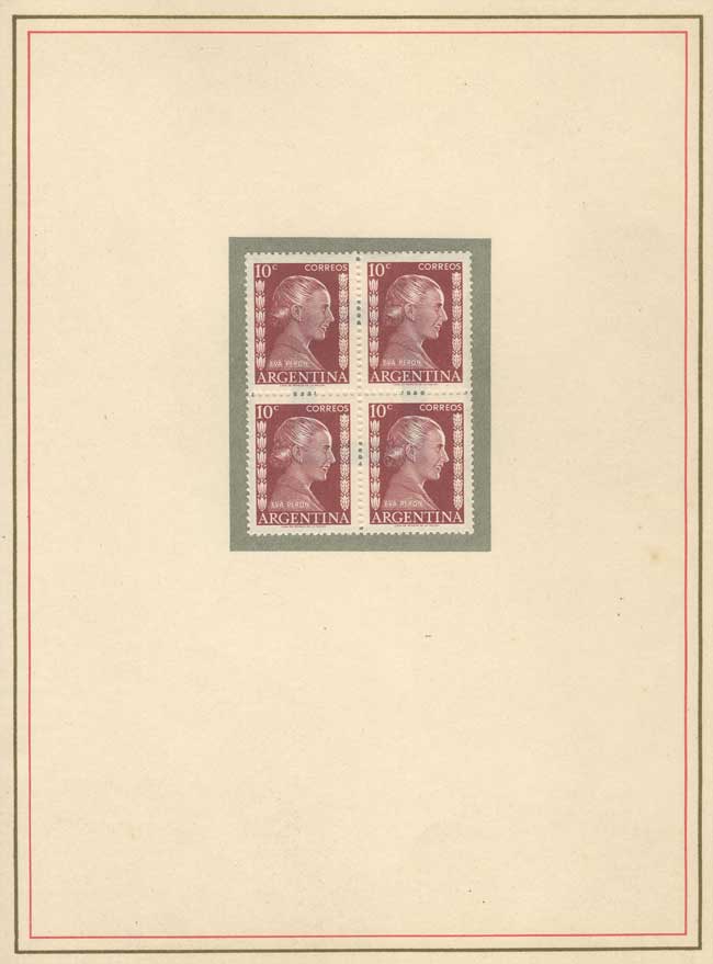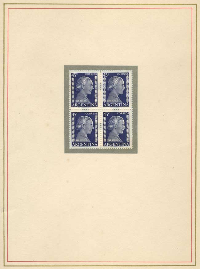 GJ.1003/22, 1952 Eva Perón, TRIBUTE BOOK prepared by the Post after her passing, edited in August 1952, it contains the set in BLOCKS OF 4, deluxe leather binding with golden impression of the coat of arms. Excellent quality, rare! (Image) (Image-02)