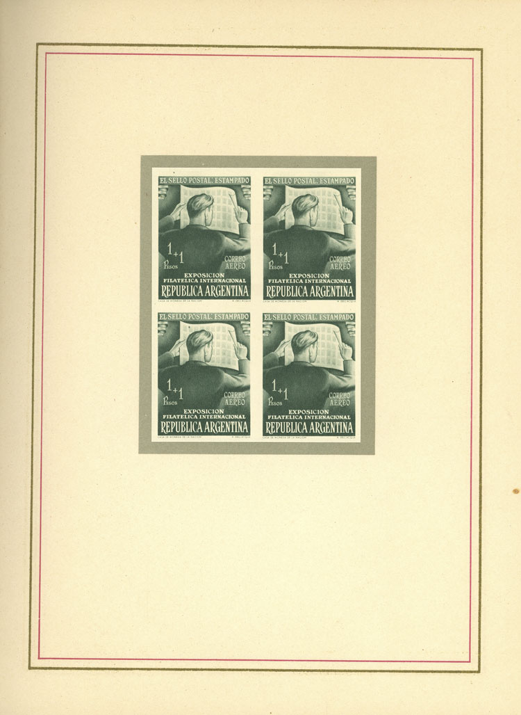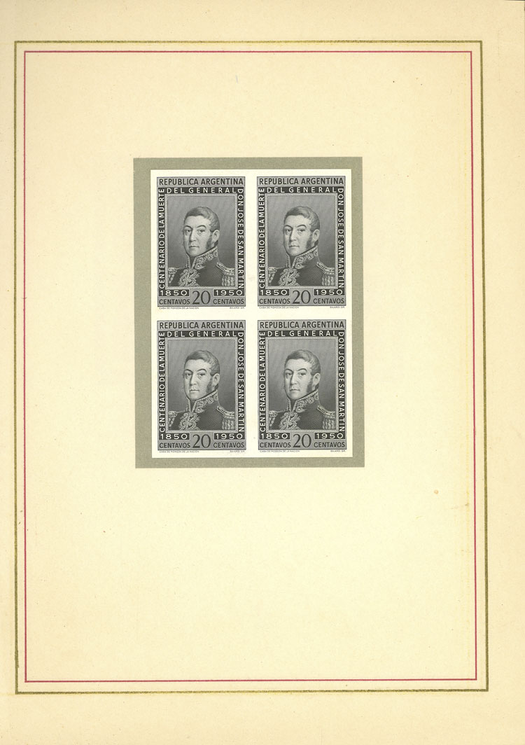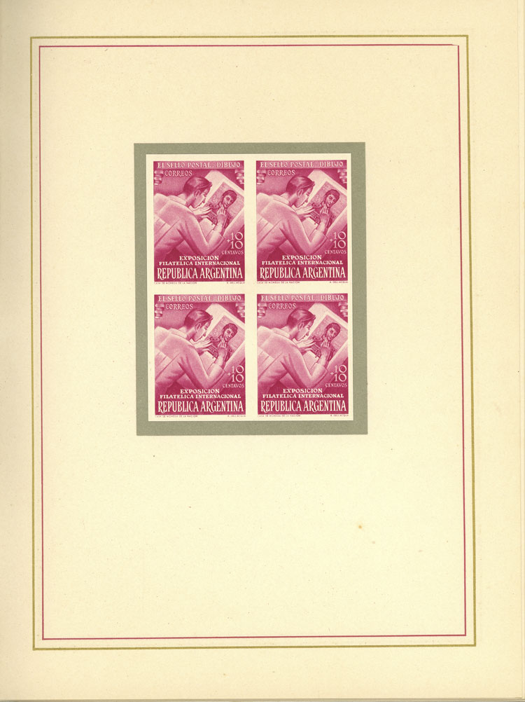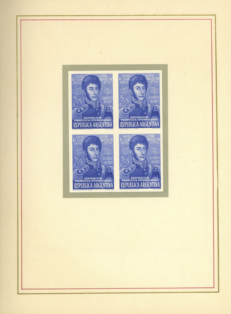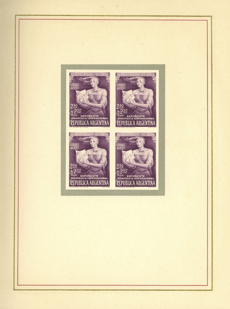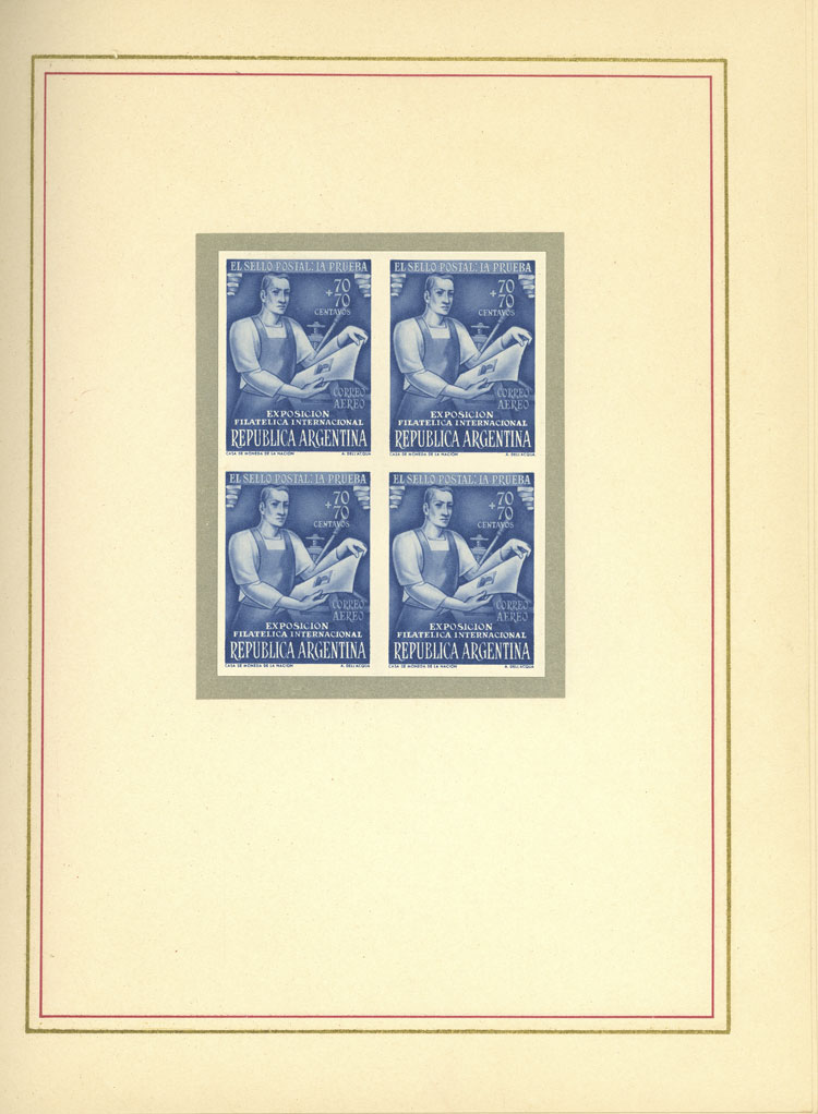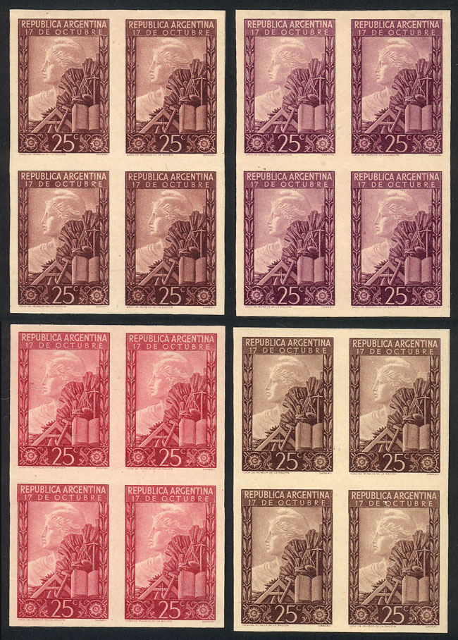 1948 Commemoration of October 17, Peronist Loyalty Day, trial color PROOFS in blocks of 4, 4 different colors, VF quality! (Image)