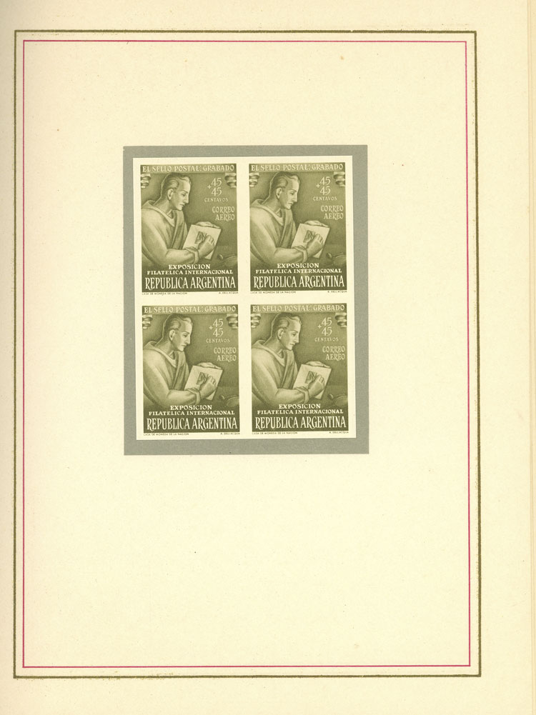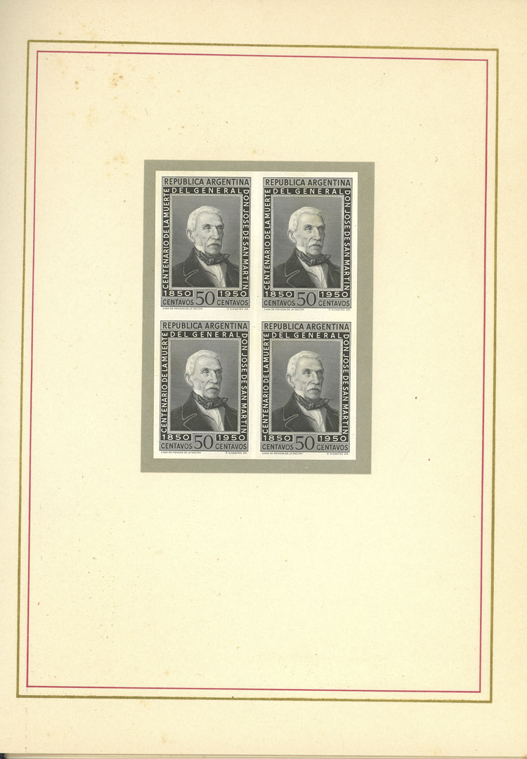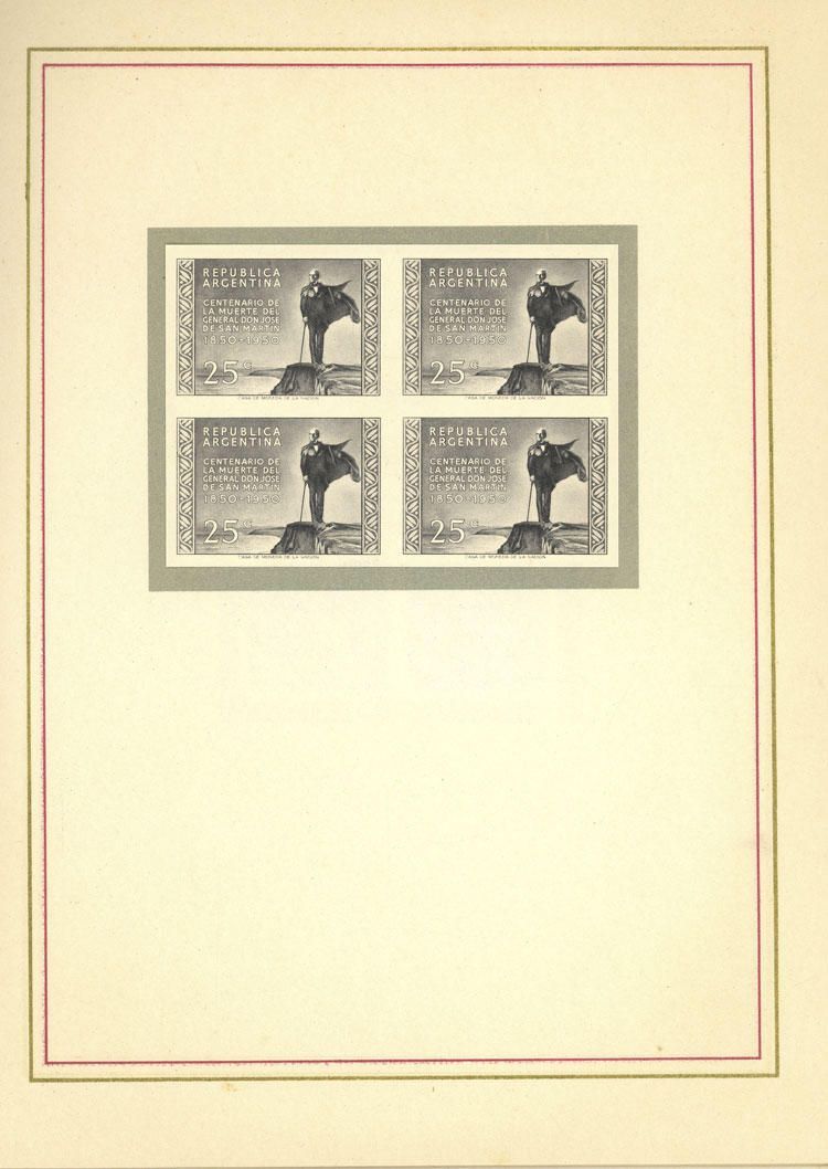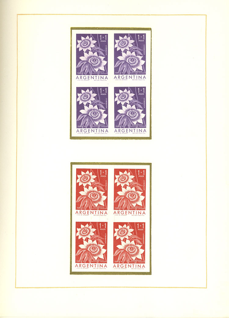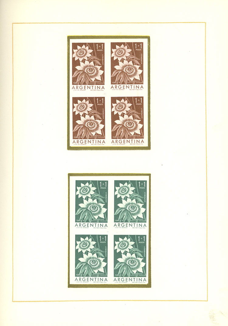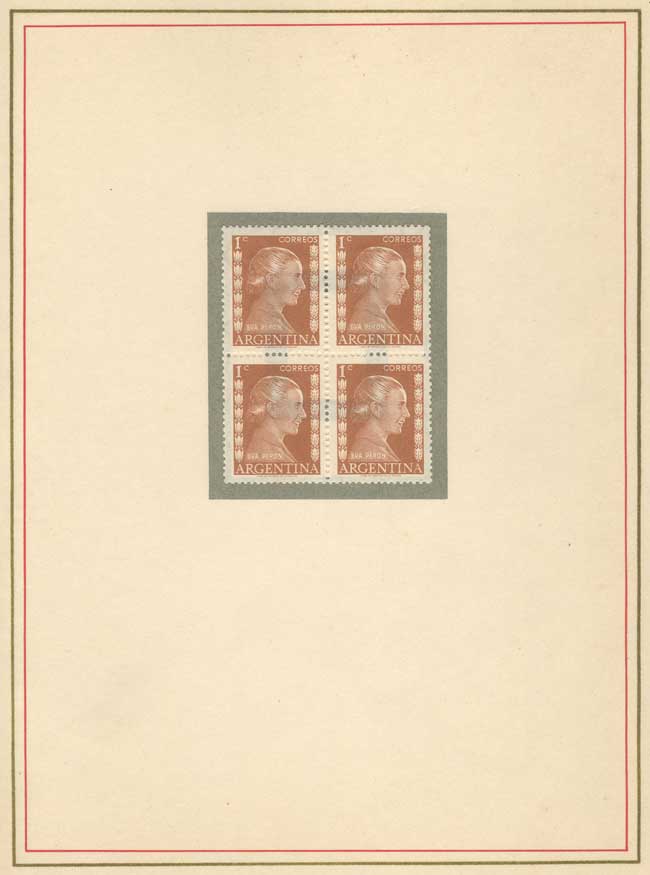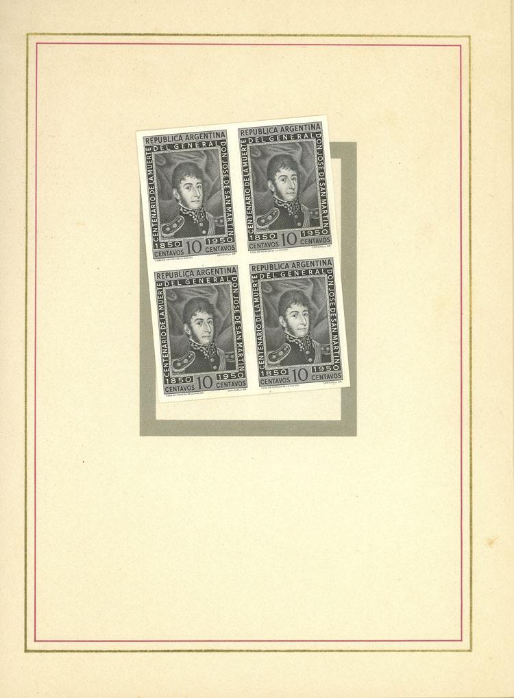1948 Commemoration of October 17, Peronist Loyalty Day, trial color PROOFS in blocks of 4, 4 different colors, VF quality! (Image)