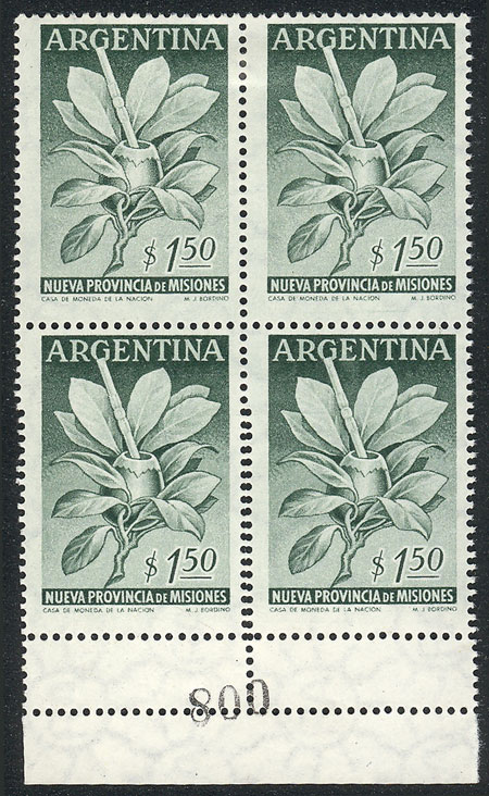 1956 Yerba Mate, block of 4, bottom stamps with DOUBLE PERFORATION variety creating small labels in the sheet margin, VF! (Image)