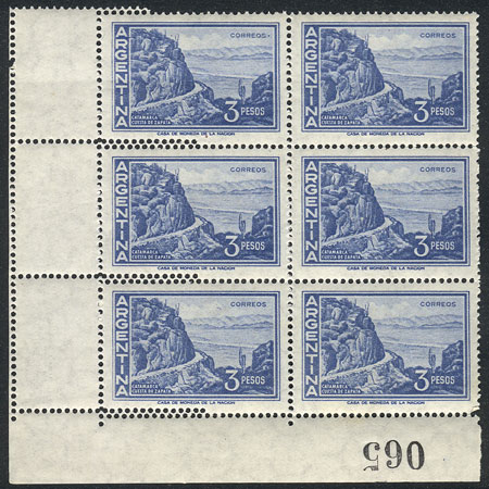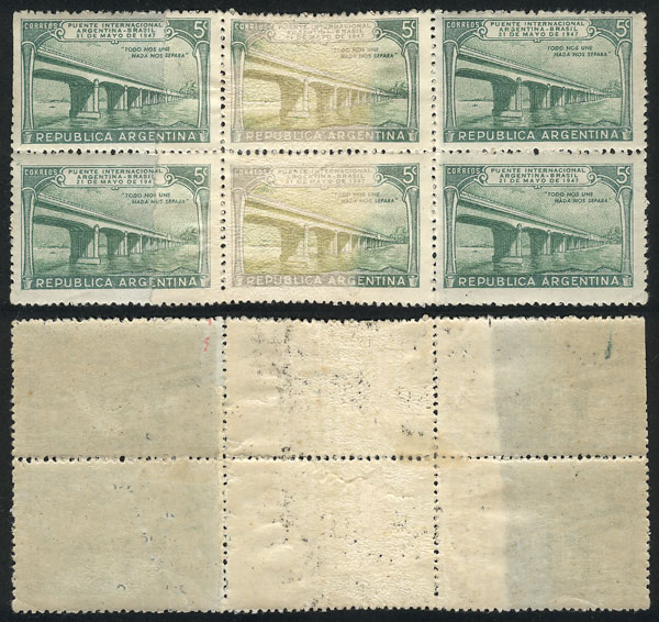 1947 Argentina-Brazil bridge, JOINT PAPER (end-of-roll splice) block of 6. To join both rolls of paper, some type of aggressive adhesive was used that in time affected the color of the stamps, which in that area turned to lemon yellow. Excellent