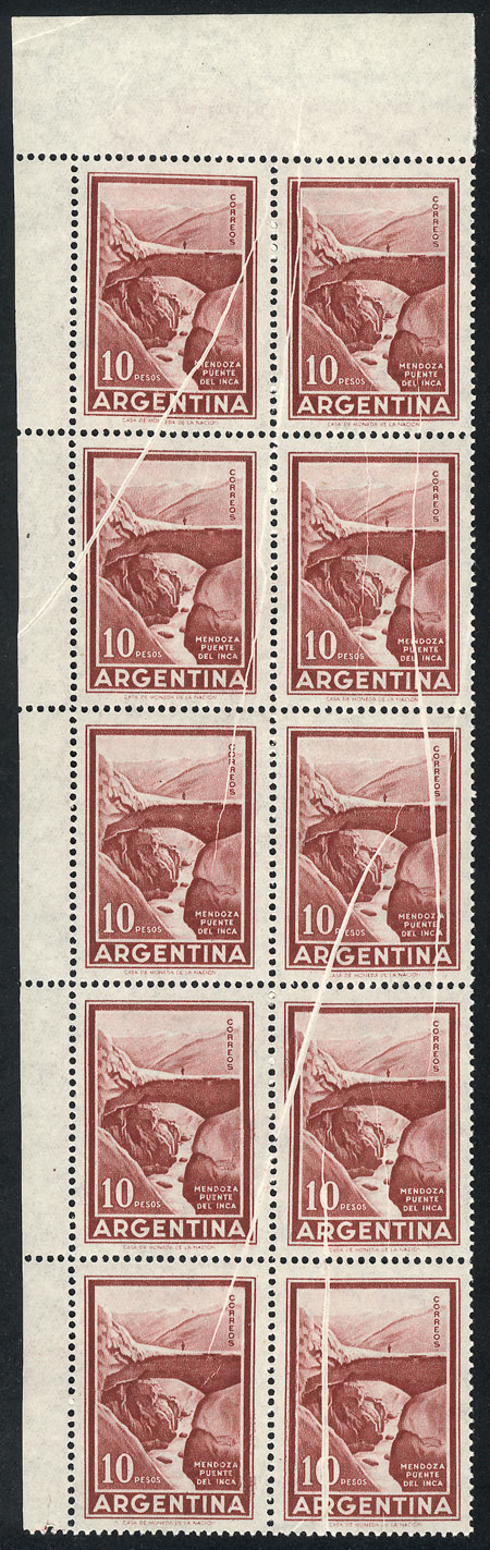 1959/64 10P. Incan bridge, national unsurfaced paper, corner block of 10 with VARIETY: many paper folds, excellent quality, fantastic! (Image)