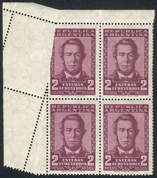 1954/7 2P. Echeverría, block of 4 with spectacular perforation VARIETY creating a diagonal label on the left, VF! (Image)
