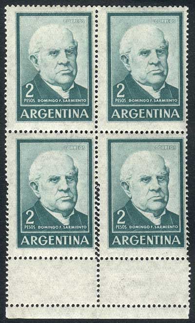 1959/64 2P. Sarmiento (teacher, politician) block of 4 with variety: double perforation at bottom creating two small labels, VF! (Image)
