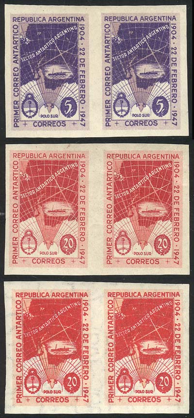 944P + 945P, 1947 First Antarctic mail, complete set of 3 IMPERFORATE PAIRS (5c. unwatermarked + 20c. with and without watermark), VF quality! (Image)