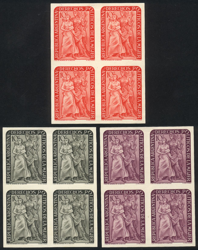 1951 Women's political rights, trial color PROOFS in blocks of 4, 3 different colors, VF quality! (Image)