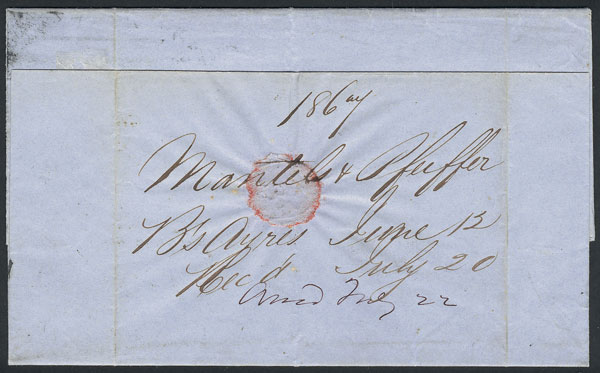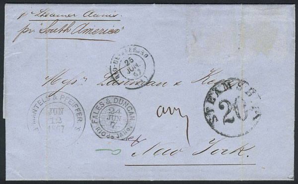 Entire letter dated Buenos Aires 12/JUN/1867 and sent to New York via RIO DE JANEIRO, routed by "FALES & DUNCAN" (forwarding agents in Rio) on 24/JUN, with New York arrival of 20/JUL, VF quality, very interesting. The cover had an