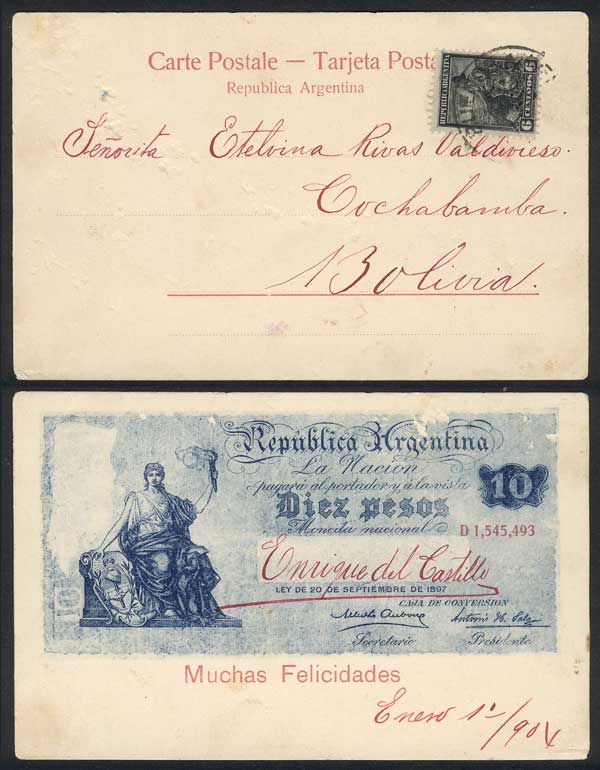 postcard showing view of a 10P. Caja de Conversión banknote, franked by GJ.223 and sent from Buenos Aires to Cochabamba (Bolivia) on 1/JA/1904, unusual destination, very pretty! (Image)