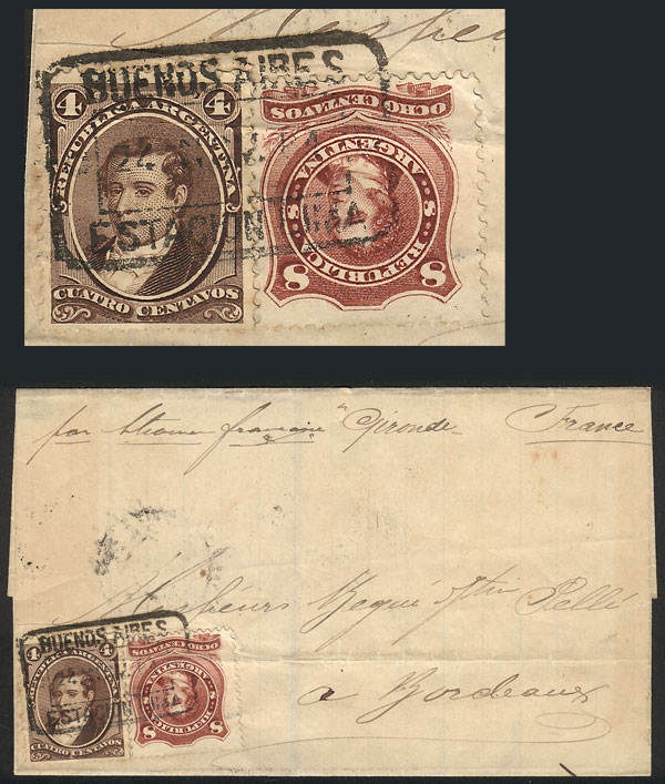 Cover sent from Buenos Aires to Paris on 8/DE/1883 franked with 36c. including GJ.52 (San Martín 24c. rouletted) + GJ.63 (12c. Little Envelope), with attractive mark of French mail, VF! (Image) (Image-02)