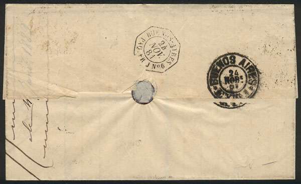 Folded cover franked by GJ.36 + 54 cancelled "BUENOS AIRES - ESTACION LIMA", sent to France on 24/NO/1881, with backstamp of Buenos Aires and octagonal mark of French paquebot, very nice! (Image) (Image-02)