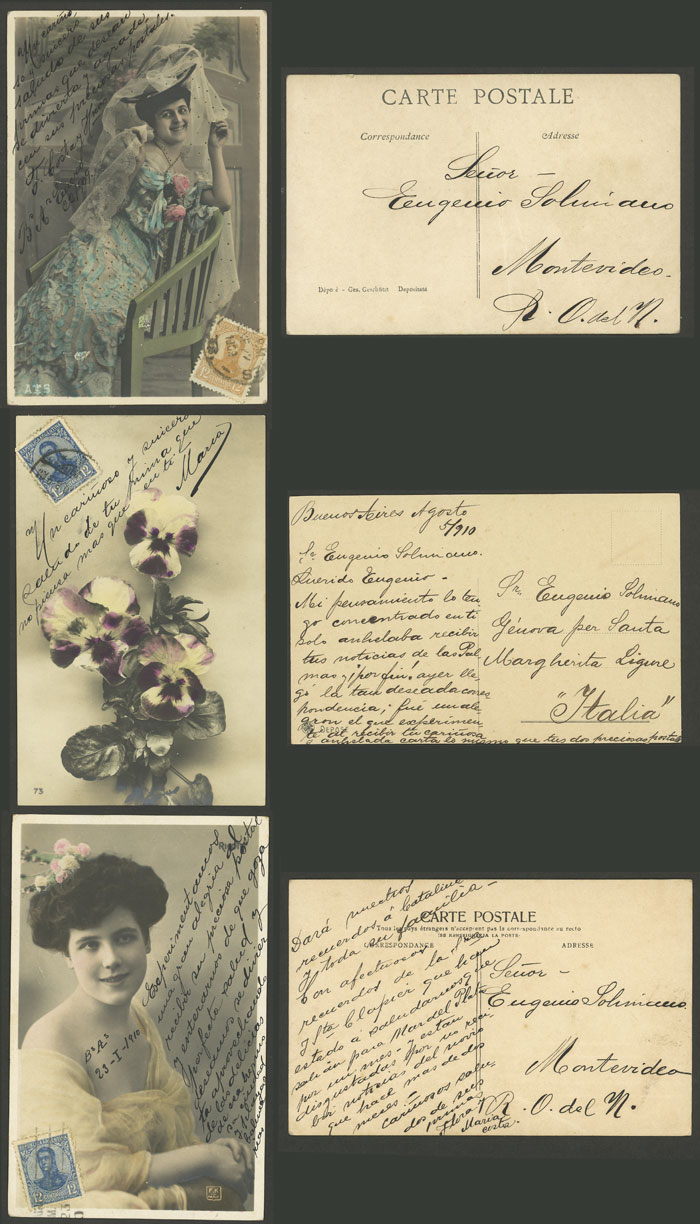 Postcards sent to Montevideo and Italy in 1909 and 1910 (2), the former franked with San Martín in oval 12c. orange (GJ.294, it was valid for a few weeks!), and the rest with the 12c. blue (Argentina changed the color of this stamp to comply with UPU