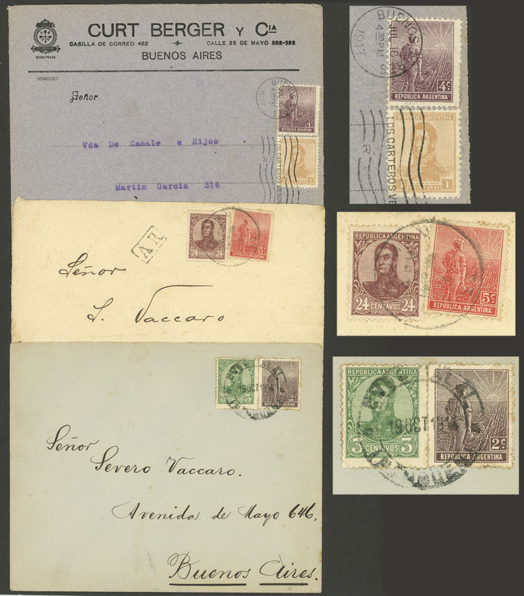 Covers + 1 front used between 1914 and 1917 with POSTAGES COMBINING stamps of the issues San Martín in oval + Plowman (2) and Plowman + San Martín of 1917, very fine quality, very attractive group! (Image) (Image-02)