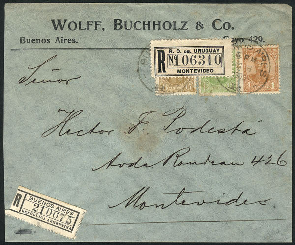 Registered cover franked by GJ.277 + 284 (total 22c.) sent from Buenos Aires to Montevideo on 12/OC/1909, very nice! (Image) (Image-02)
