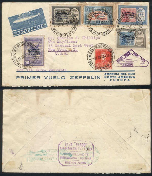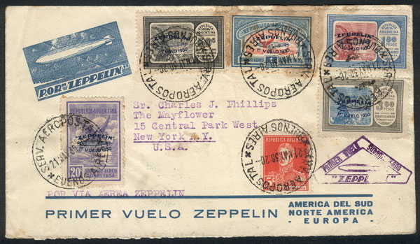 franked with the Zeppelin set of 5 values with blue overprint (the 20c. value with green overprint), sent from B.Aires to New York on 21/MAY/1930, with special handstamp of the flight and arrival backstamp, little defects, rare (Michel 66F) (Image) (Image-02)