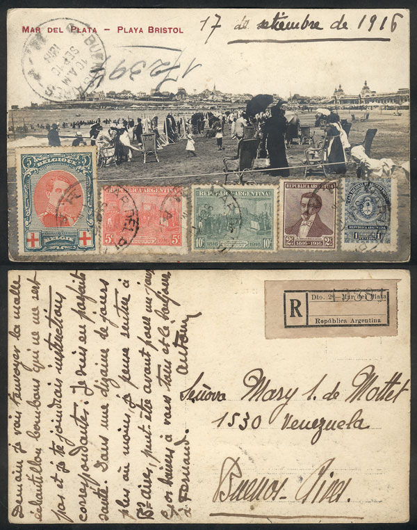 PC with view of Bristol Beach, franked with postage stamps + a Belgium 5c. stamp + 1c. stamp of POSTAL SAVINGS BANK, sent by registered mail from Mar del Plata to Buenos Aires on 17/SE/1916, VF quality! (Image)