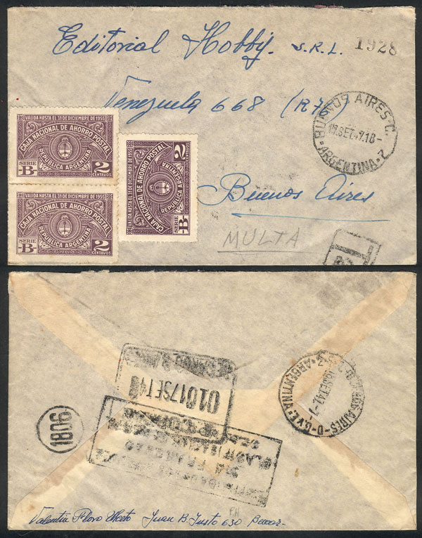 from Beccar to Buenos Aires on 18/SE/1947 franked with 3 stamps of 2c. POSTAL SAVINGS BANK, which had no postal value. On front and back it bears several POSTAGE DUE marks, VF quality, interesting! (Image)