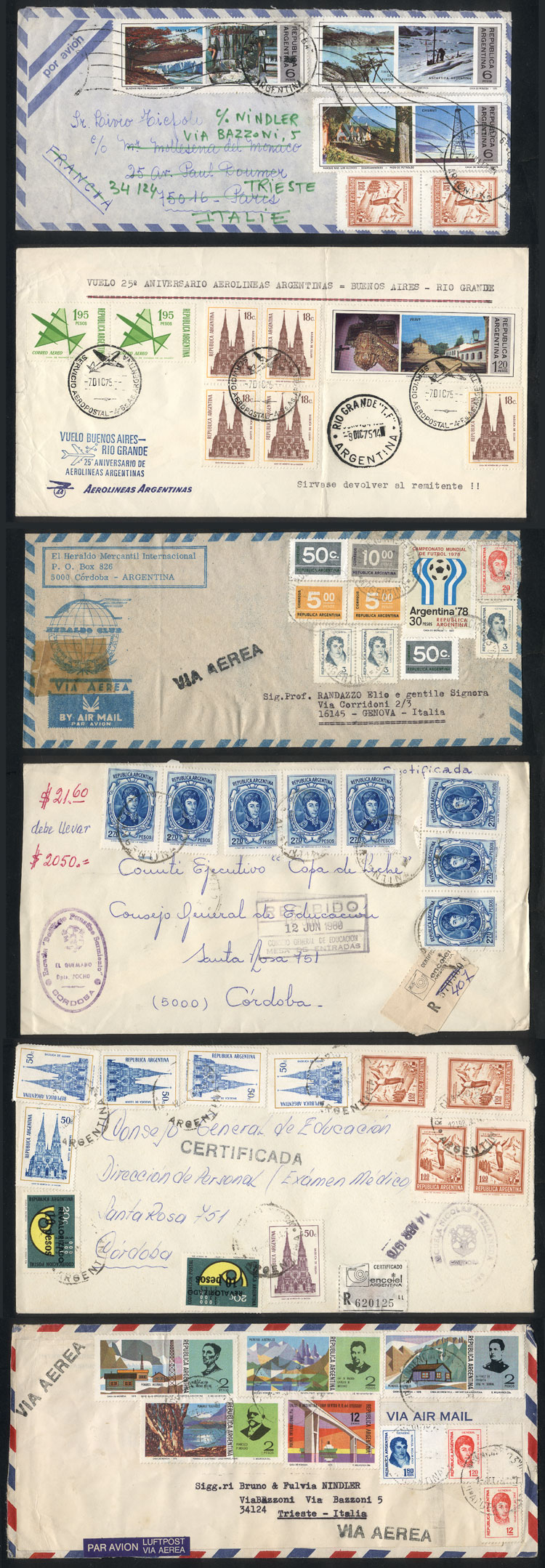 Covers sent from Yugoslavia to Buenos Aires, all with meter postages and sent to POSTE RESTANTE, the service was paid with various Argentine postage combinations by the recepient, with rates that changed with time, including several with rare