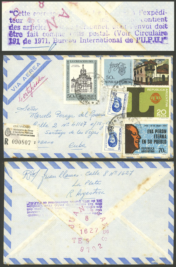 sent from La Plata to Cuba on 16/OC/1973 and returned to sender with interesting violet postal marking applied on back, apparently it contained articles that were not allowed to be mailed! (Image)