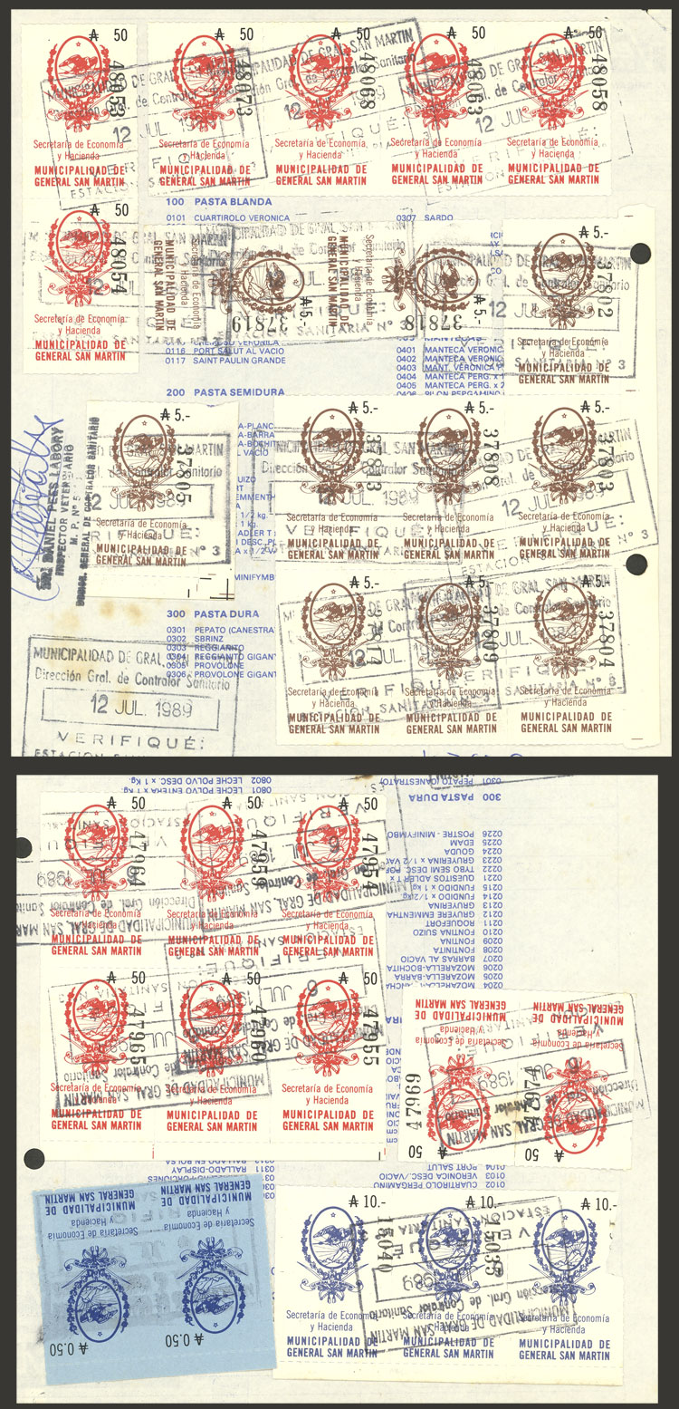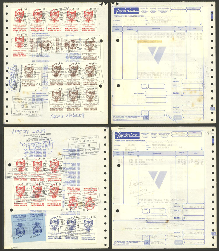 GENERAL SAN MARTÍN: 2 invoices for dairy products of the year 1989 with large number of revenue stamps, rare! (Image) (Image-02)
