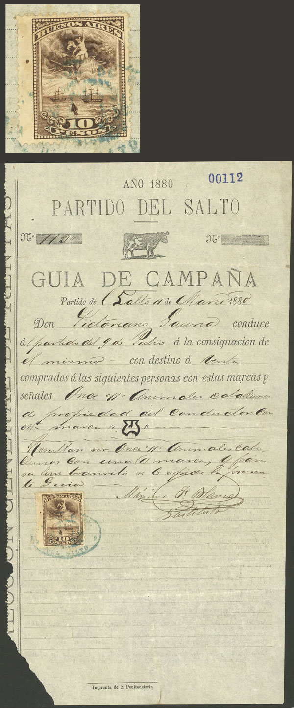 (cattle movement) of the municipality of Salto in the province of Buenos Aires, year 1880, with revenue stamp of 10P., very rare on this doc! (Image)