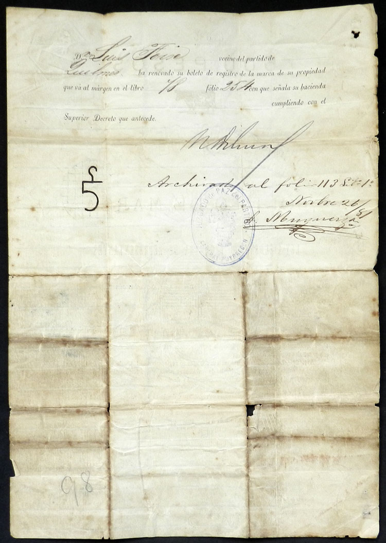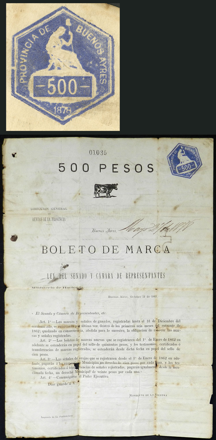 Province of Buenos Aires: Brand registration for cattle of the year 1878 with value of 500P., very rare! (Image) (Image-02)