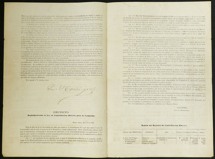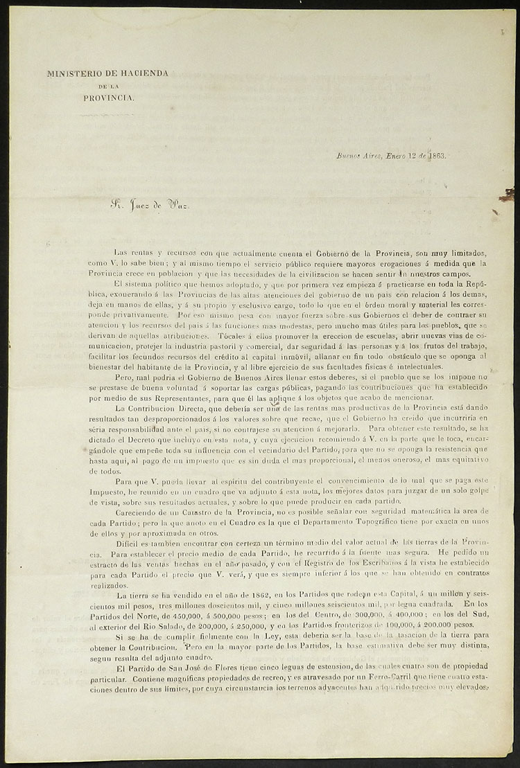 Province of Buenos Aires: Printed document of the year 1863 with a decree of the Ministry of Finances imposing a fee of 3 per thousand for a property tax, including considerations related to the low tax collection in several districts of