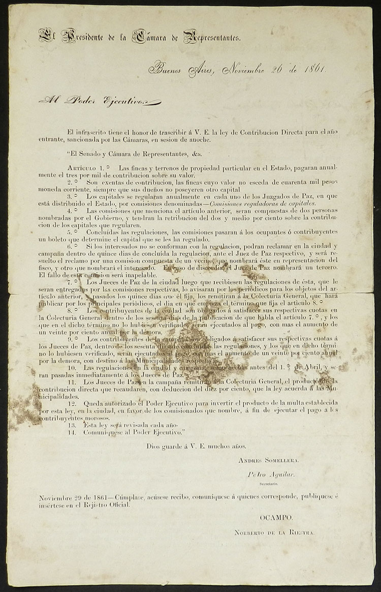 Printed sheet of 1861 with text of the law about revenue stamped paper of the province of Buenos Aires, with some stains, rare! (Image) (Image-02)