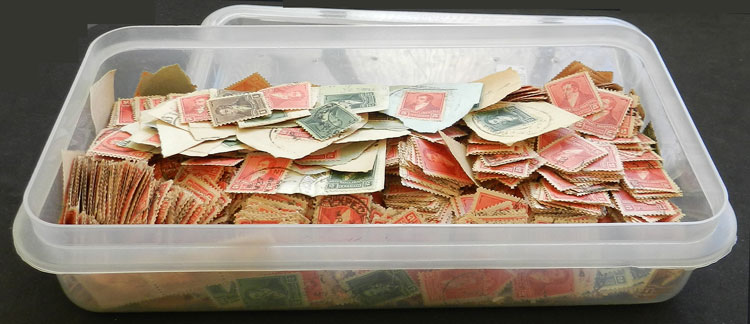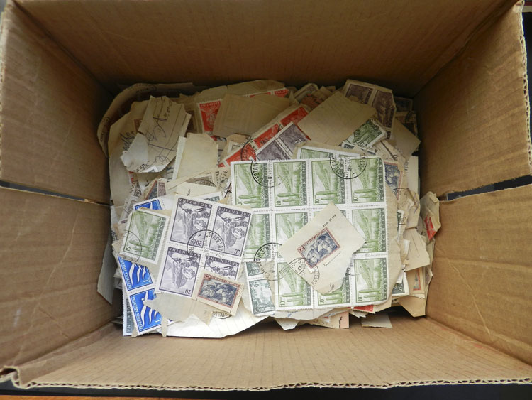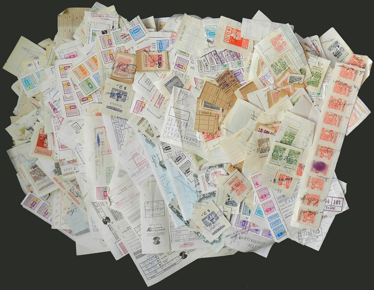 Box with more than 6,500 used revenue stamps, almost all on fragments, wide variety, VF quality, VERY LOW START! (Image) (Image-02)