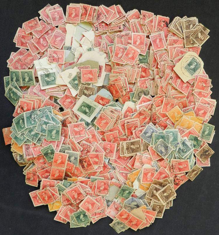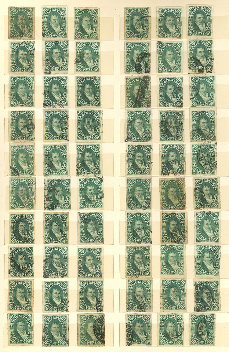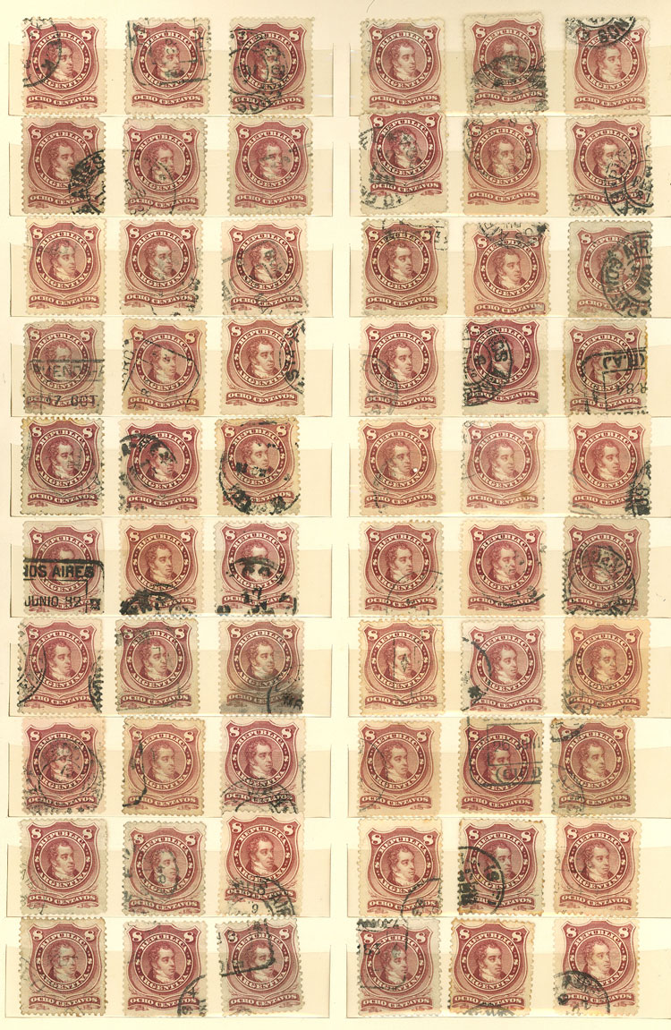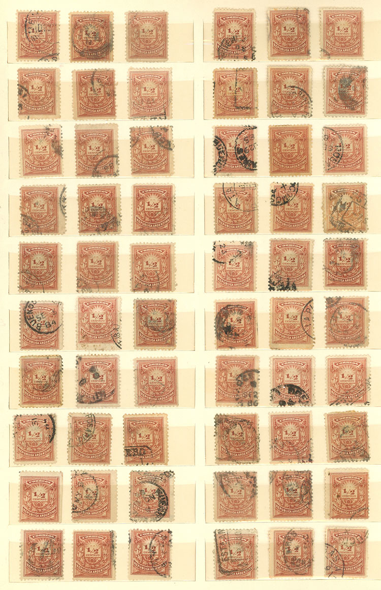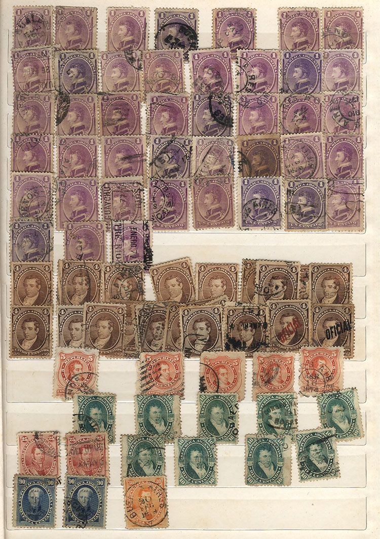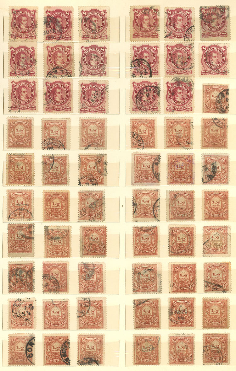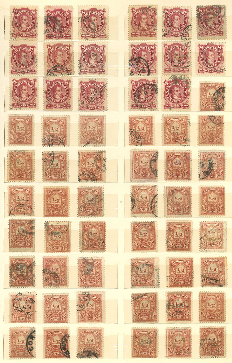 SEVERAL THOUSANDS stamps of the Rivadavia Belgrano & San Martin issue, used and COMPLETELY UNCHECKED. The expert will surely find watermark and perforation varieties, also good cancels, very attractive! (Image) (Image-02)