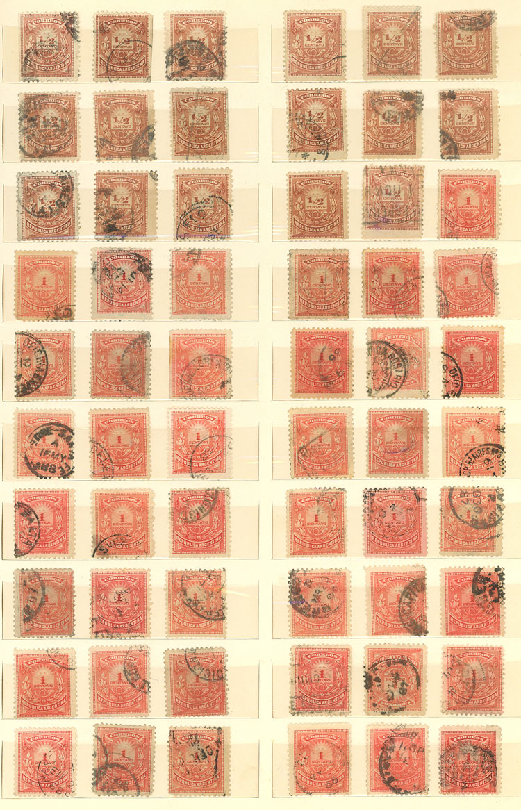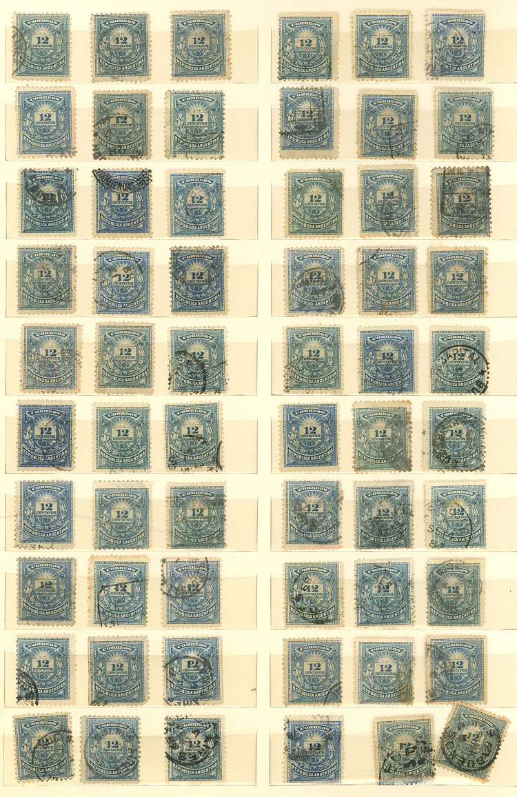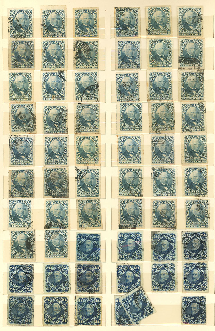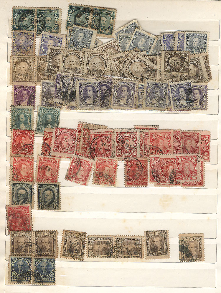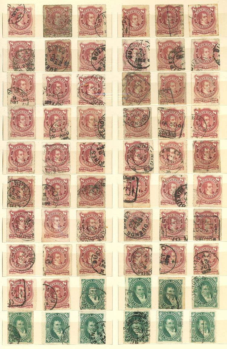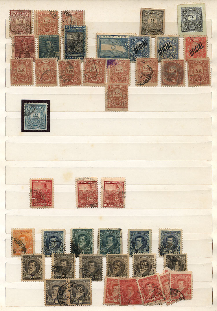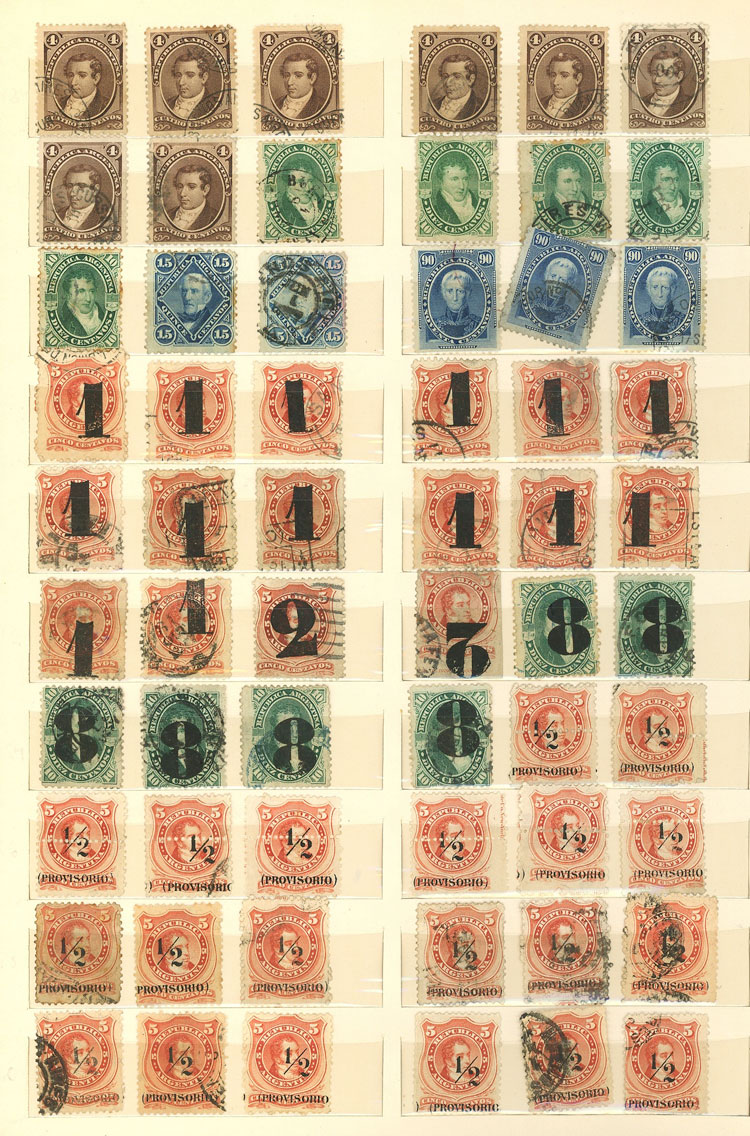 SEVERAL THOUSANDS stamps of the Rivadavia Belgrano & San Martin issue, used and COMPLETELY UNCHECKED. The expert will surely find watermark and perforation varieties, also good cancels, very attractive! (Image) (Image-02)