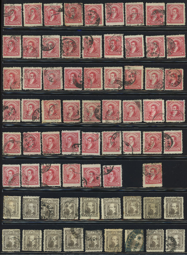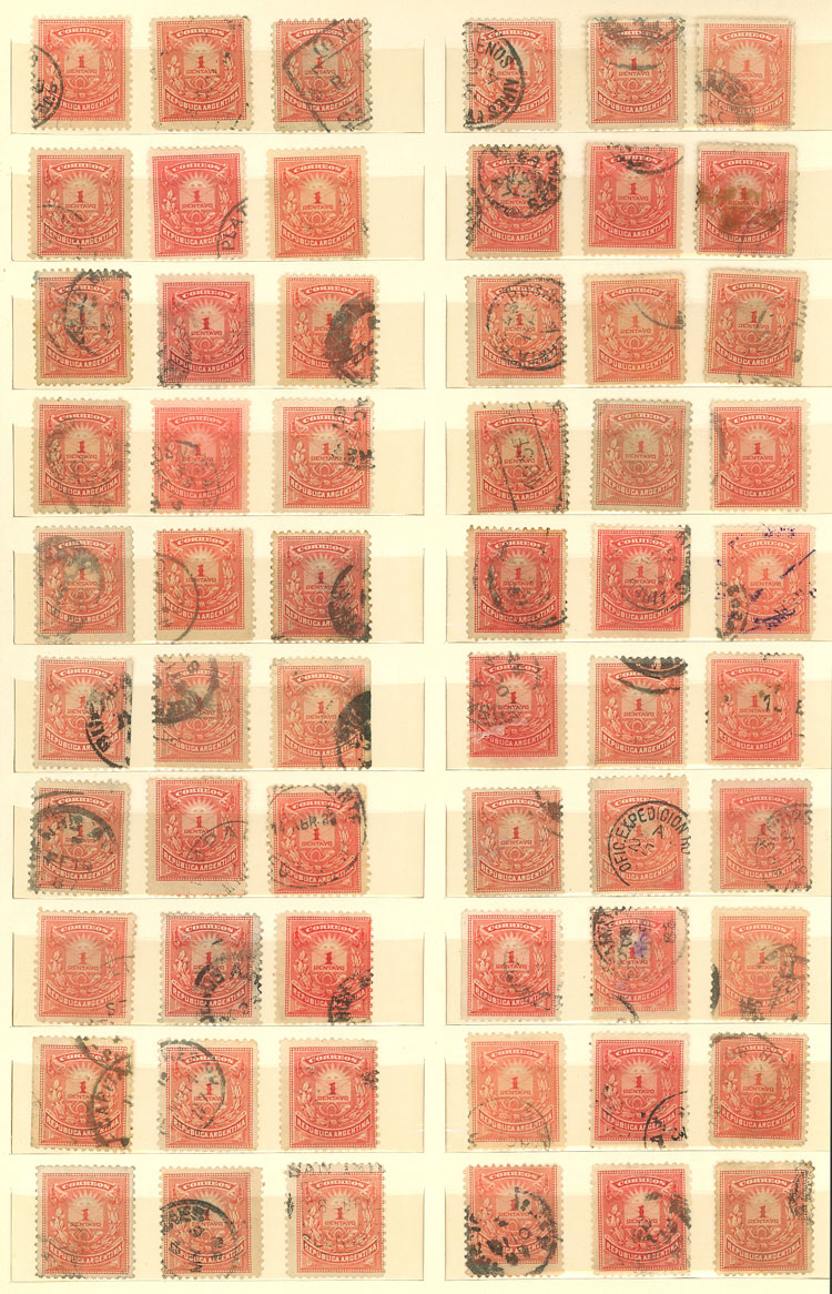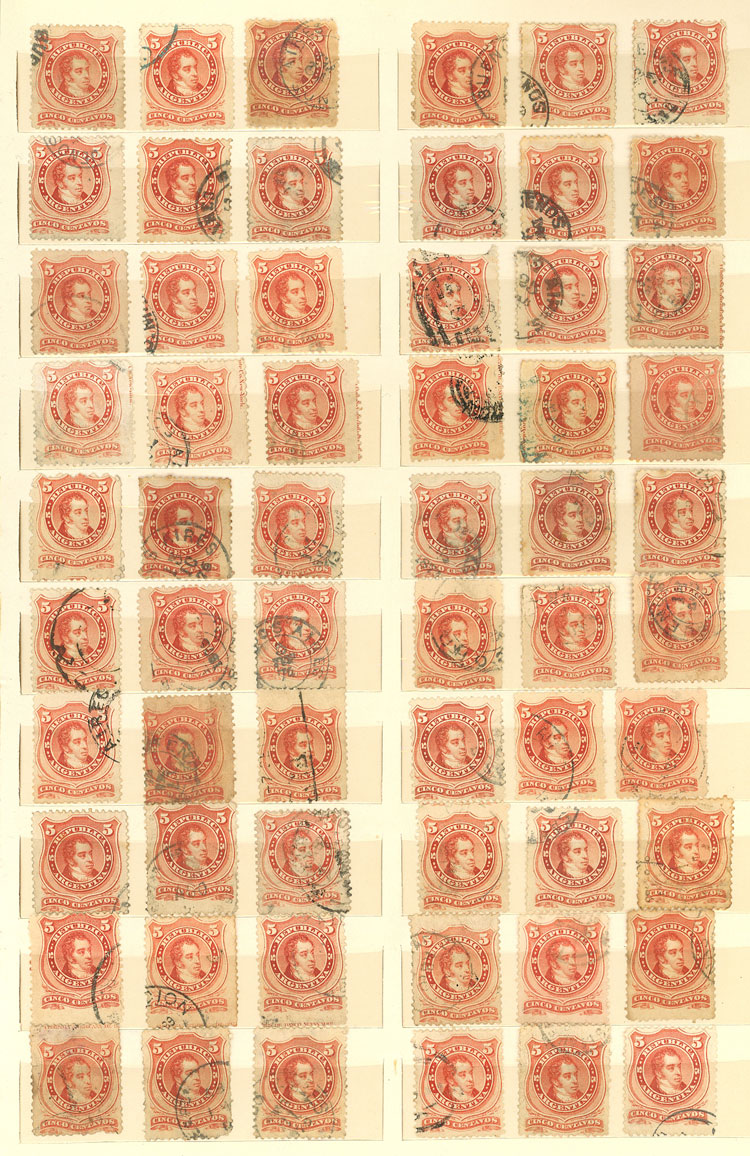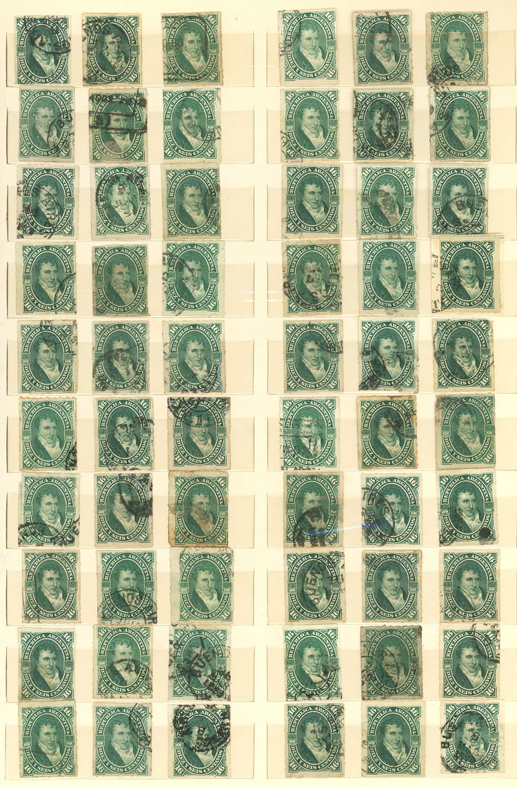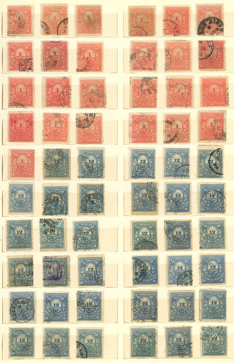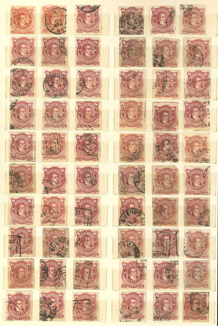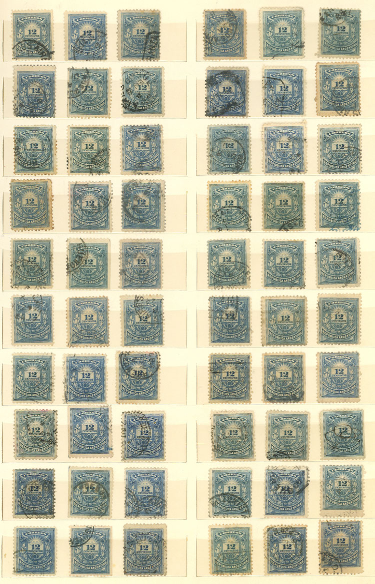 SEVERAL THOUSANDS stamps of the Rivadavia Belgrano & San Martin issue, used and COMPLETELY UNCHECKED. The expert will surely find watermark and perforation varieties, also good cancels, very attractive! (Image) (Image-02)